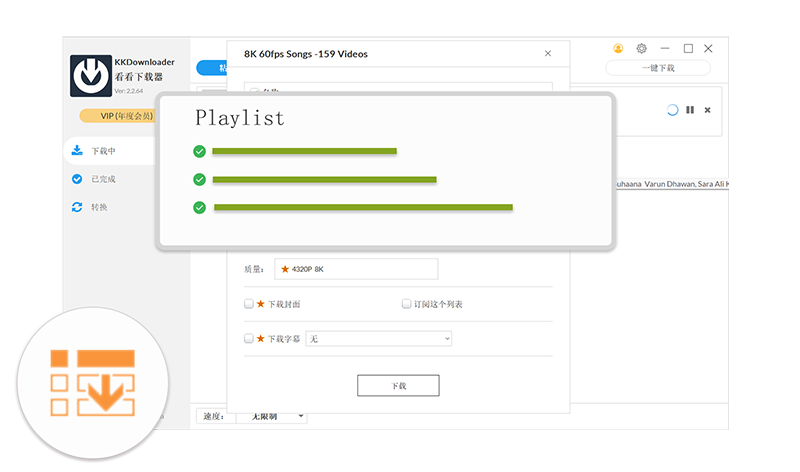 KKDownloader是一款功能强大的全能视频下载工具,支持从主流平台如YouTube、B站等下载长视频、播放列表、主页频道,以及从TikTok、Instagram等下载无水印的短视频。它还可以从1000多个全球热门网站下载视频、音频、图片和字幕,支持VR/8K/4K等高清格式下载,兼容多种视频和音频格式,是您下载和管理多媒体资源的理想选择。