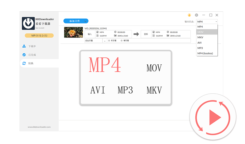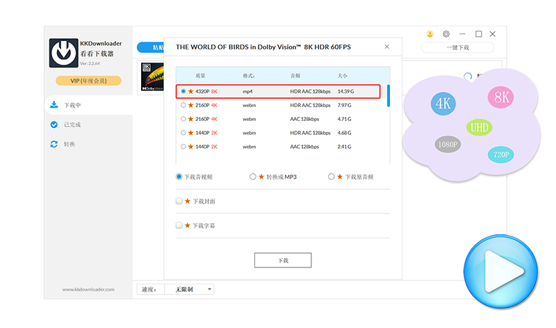 KKDownloader具备内置视频转换功能,支持多种4K、8K、HDR视频格式的转换,包括MP4、AVI、MOV、MKV等。下载过程中也可以自动将视频转换为常用的视频和音频格式,如MP4、AVI、MKV、MP3等,让您的媒体文件适配更多设备。
