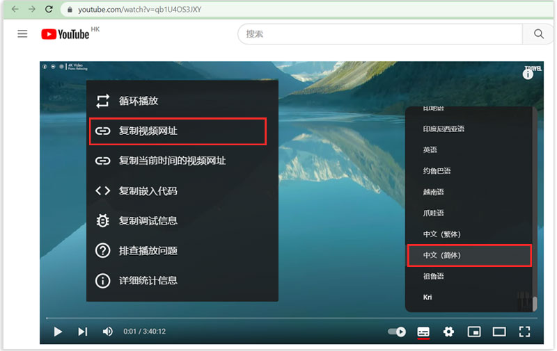 步骤1: 在浏览器中打开youtube视频,右击复制链接地址