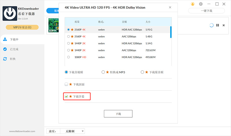 步骤3: 当完成解析后,软件会弹出分辨率选择框,勾选下载字幕并选择需要下载的语言,然后点击 开始下载 按钮